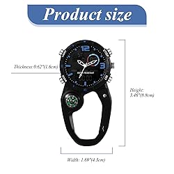 - Lancardo Clip on Carabiner Watch: Multi-Function Backpack Watch for Men Women Analog Digital Date LED Alarm Sport Watch Hiking ClimbingHIGHLIGHTS:Easy read Roman numerals markersHigh quality Quartz movement and batteryHigh Hardness Glass Watch CasePRODUCT DESCRIPTION:Length: Height: 3.46inch (8.8cm)Width: 1.69inch (4.3cm)Thickness: 0.62inch (1.6cm) Weight (kg): 0.039 // Weight (oz): 1.39PACKAGE INCLUDED:1 x watch1 x watch bag
