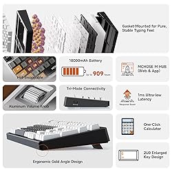 Speed, Control, Simplicity: Smart touches make daily work smoother—like instant mute during meetings, precise volume control, or an enlarged 2U0 key that’s easier to press when typing fast. Every detail is right at your fingertips A Shared Vision with Unbox Therapy: After the success of the GX87 - our first collaboration with Unbox Therapy—we wanted to go further. Lewis called the UT98 one of his favorite keyboards, and this time, we pushed the idea of a silent mechanical keyboard even further Premium Switch Options: Choose between two custom linear switches: Silent Peach V3 and Icy Creamsicle. Whether you prefer near-silent operation or a Hi-Fi typing sound, both deliver an exceptional typing experience with outstanding comfort and feel Hot swappable Custom Mechanical Keyboard: Hot swap PCB sockets allow you to customize the feel of MCHOSE UT98 wireless gaming keyboard with 3pin & 5pin mechanical switches without soldering issue. The wireless mechanical keyboard are equipped with pre-lubed premium switches, bringing a smooth and responsive feel Gasket Mount Structure: Built with five layers of premium dampening material, the UT98’s gasket mount design absorbs vibrations and softens impact for a stable, consistent, and ultra-smooth typing experience. Every press feels satisfying—quiet yet responsive Tri-Mode Connection & Large Capacity 10000mAh battery: MCHOSE UT98 Bluetooth keyboard provides three connection modes, including BT5, 2.4GHz and USB, which can connect up to 3 devices and easily switch by FN and key combination. The rechargeable keyboard built-in 8000mAh large capacity battery provides more power and 500 hours battery life Vibrant Soft Light RGB: Bring your desk to life with 16 million customizable colors. Fine-tune brightness, effects, and reactive modes via MCHOSE HUB for the perfect atmosphere. NOTE: The keycaps are non-shine-through, so the backlight will shine around the keys but not through the characters