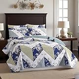 WHWODIDE Floral Patchwork Quilt Set Queen 3 Pcs Wave Blue Flower Pattern Bedspread Comforter Soft Lightweight Microfiber Bedding Set with 2 Pillow Shams for All Season (Wave Blue, Queen)