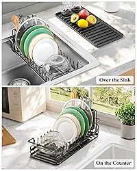 SPACE-SAVING ORGANIZER: This in sink dish drying rack is built with a compact 14.0" x 6.3" x 8.0" frame designed to sit neatly in or over the sink. Its slim footprint avoids blocking the basin during washing. You can dry dishes efficiently while keeping the sink fully usable in small kitchens. 3 PLACEMENT OPTIONS: This sink dish drying rack features an extendable length from 14.0" to 20.9", supporting countertop use with a tray, over-sink hanging, or in-sink placement. The adjustable design securely fits different sink sizes. It's easy to switch setups to match your changing kitchen layouts and routines. REINFORCED COUNTER SUPPORT: This dish drainer for kitchen counter features handles that extend 1.8" over the countertop edge and are fully wrapped in anti-slip material. This design reinforces countertop support and keeps the rack securely anchored during use, letting you dry dishes over the sink with confidence. NEAT DISH DRYING: This dish rack features a raised plate rack that holds dishes upright, while side anti-slip posts prevent them from sliding off, keeping items separated and stable. Its removable dual-slot cutlery holder categorizes utensils, allowing for faster drying and a more organized sink area. FLEXIBLE ASSEMBLY: This dish drying rack features a simple, stackable structure that assembles quickly without tools. The rack and bottom tray can also be used separately to create two drying zones. Enjoy flexible setup options and double the drying capacity to handle different dish loads with Kitsure!