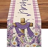 Croar He is Risen Easter Cross Christian Table Runner, Religious Lavender Daisy Flower Purple Plaid Kitchen Dining Table Decoration, Spring Burlap Indoor Outdoor Home Decor Party Supply 13 x 60 Inches