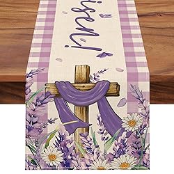 Polyester Uniquely Designed Table Runner: Our linen tabletop runner is designed with the most current elements to add style and vibrancy to your home. Table runner is printed with cross, lavender and daisy floral, butterflies, purple tartan checker patterns, which is the perfect decoration for Easter. Express your positive outlook on life by decorating your coffee table, dining table, buffet and kitchen with our seasonal table runners in a variety of themes High Quality Table Decor: Made of 100% spun polyester, this stylish table scarf is durable and eco-friendly. 13" x 60" with exquisite edges. Tabletop tablecloth is printed in high definition, the colors are bright and not easy to fade, it is easy to match your home decoration. Regular style is suitable for spring, summer, fall and winter Widely Use: Long table runner is suitable for decorating sideboards, tables, buffet cabinets, TV tables, farm tables, coffee bars, buffet tables, dressing tables, making your life unique and elegant. This camino de mesa is not only suitable for everyday meals, but also for family gatherings, indoor and outdoor gatherings for Christmas, Thanksgiving, Easter, 4th of July, and more! Perfect Kitchen Decor: Our table collection is a must-have for parties and dinners. Beautiful looking burlap table runner can be used for coffee table runners, dresser runner, as well as dining table, shoe cabinet and coffee table decorations to set a festive atmosphere for parties and impress guests. Ideal for holiday and housewarming gifts Care Instructions: Machine washable, hand wash recommended. Air dry on low heat and remove before completely dry to minimize wrinkles, if desired use low iron