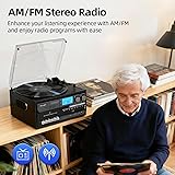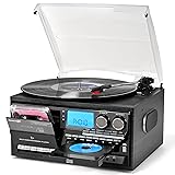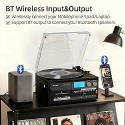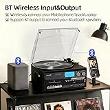 [All-in-one Music Center Record Player with Speakers] - The 10-in-1 music center record player turntable built-in two speakers, lets you play vinyl records, CDs, cassettes, USB/SD, support BT input and output, AM/FM radio, Aux-in, headphone, RCA line output, vinyl/CD/tape recording to USB, also add a remote control(not battery included) [Wireless BT Input and Output Functions] - You can connect to your phone via Bluetooth input to play songs from your phone list, or use Bluetooth output to connect to your Bluetooth speaker. If necessary, this turntable includes channel and line outputs. You can use RCA cables to connect active speakers [Vinyl/CD/Cassette Recording to USB/SD] - Converting Vinyl, CD,Cassette to USB/SD(MP3 Format) and Recording vinyl, CD, Cassette to USB/SD directly. From nostalgic records to modern digital media, this turntable offers limitless listening possibilities [AM/FM Radio Playback] - Search for radio stations, capture your favorite radio programs with the built-in AM/FM tuner. Whether you enjoy music, talk shows or the latest news, this feature adds a brand-new way to your listening options [Great Idea for Vinyl/CD/Tape Collectors] - Perfect for vintage collectors and new listeners alike, it brings out the best in every record, filling your space with rich, authentic sound. It's a fantastic gift on the Thanksgiving, Christmas, Mothers Day, Fathers Day, Birthday