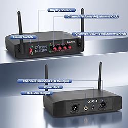Stable wireless microphone:High quality cardioid capsule and improved circuitry design of each handheld microphone can capture sound and transmit smoothly without dropouts, hiss, or feedback, delivering robust, clean, and stable sound quality. Plug and play, no need to pair:The professional wireless microphone system is suitable for input devices with 1/4 "and 1/8" interfaces. It is very suitable for microphone jack speakers, phonographs, audio amplifiers, PA systems, voice amplifiers and more streaming media devices. Turn on the receiver switch, then plug the receiver into the device connector, and finally turn on the handheld wireless microphone switch, wait for the microphone and receiver to automatically connect, and then you can use it. Note: Do not insert AUX jack. Wireless microphone-4 channel - the body and microphone are made of PVC material, making the device more portable and easily suitable for families, outdoor schools and other occasions Independent microphone volume control: This unit has an independent adjustable volume control for each of the four dynamic microphones, so you can balance the vocals as needed. Perfect for professional events, conferences, PA, DJ parties PACKAGE LIST: Wireless Microphone x 4; Receiver Box x 1; Power Adapter x 1; 6.35mm to 6.35mm Cable x 1;Audio Cable x 1; Microphone Windscreen x 4; Antiskid Ring x 4; User Manual x 1.