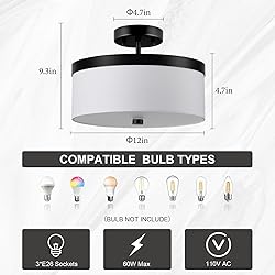 Modern Drum Light Design:The semi-flush mount ceiling light is Featuring a sturdy black-finish metal frame and a classic white fabric drum shade, this flush ceiling light brings a sleek, modern touch to any space. The 12-inch ceiling light fixture includes a frosted diffuser that softens and evenly distributes the light—reducing glare and protecting your eyes while providing a warm, balanced glow that enhances both everyday functionality and ambient appeal. Dimensions&3-Light Stocket:With dimensions of 9.1 x 4.7 inches, this compact ceiling mount light is engineered to optimize spatial usage and provide abundant illumination at the same time.This modern ceiling light fixture three E26 medium base sockets (bulbs not included), each supporting up to 60W. Compatible with LED, incandescent, CFL, and halogen bulbs, it delivers ample illumination for bedrooms, living rooms, hallways, and more. The 3-light design ensures even light distribution, effectively brightening your space with wide and balanced coverage. Wide Application: Designed for versatility, this black flush mount ceiling light is ideal for a variety of spaces including hallways,corridor, porches, stairs, aisles, entryways, bedrooms, living rooms, kitchens, laundry rooms,Study rooms and more. The elegant drum fabric shade, paired with a sleek black metal frame, adds a stylish modern touch. Perfect for different types of rooms it casts a soft ambient glow that enhances the overall atmosphere. Easy Installation & Durable Build: Hardwired for secure mounting, this drum light fixture features a durable black metal frame and high-quality white fabric shade that resists rust, corrosion, and fading over time. It comes with all necessary mounting hardware and detailed instructions for quick, hassle-free installation—no complex tools or skills required, making this close to ceiling light fixtures a ideal DIY-friendly lighting upgrade. Reliable Warranty & Support: We understand that a great light fixtures ceiling mount isn't just about quality—it should also let you shop and use it with peace of mind.Your satisfaction is our top priority. We offer professional after-sales service and are always ready to assist you. If you have any questions , feel free to contact us anytime—we're here to help and committed to providing prompt, satisfactory solutions.