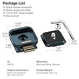 - Camera Quick Release Plate Kit, Quick Switch Square QR Mount Plate with Arca Type Clamp Base, Max Load 11lb/5kg---Square Quick Release Top Plate---1. Universal 1/4" Screw: For mini DV camcorders, DSLRs, mirrorless cameras, sliders, cell phone holders, and more. Can also mount an action camera adapter which is compatible with GoPro hero 13/12 /11/10, Insta360 X5/X4/X3 Ace Pro, etc. Thread the 1/4" mounting screw into your camera's 1/4" screw hole, then use the included L shaped hex key to tighten the screw with security.2. Anti-Slip Silicone Pad: Pad upgrades from silicone to large-textured rubber, highly elastic for tighter grip, reducing looseness.3. Versatile Four Side Arca: This square tripod quick release plate with four side Arca Type slots ensures seamless landscape to portrait compositions without removing the plate. You can just slide your camera into this tripod mount clamp base from any of the four directions, saving time and effort. 4.Lanyard Holes: square quick-release plate has four lanyard holes, easy to carry around when you're out shooting.---Arca Swiss Quick Release Base---1. Bottom Threaded Hole: The 3/8" bottom thread w Arri locating hole and a 1/4" to 3/8" adapter for camera stands, camera gimbal stabilizers, monopods, video/travel tripods, or sliders, facilitates seamless tripod and handheld shooting.2.Side Threaded Hole: The base equipped with 1/4" Arri locating hole, supports most accessories with standard 1/4" screws such as magic arms, improving the quality of photography3. Larger Locking Button: Simply press the release lock button to remove the quick release plate. 4. Safety Bolt: Equipped with an anti-misoperation limit screw (slides safety bolt to lock), it prevents accidental detachment and erroneous unlocking.5.Arca-Swiss: Versatile Mounting: This quick release plate compatible with Uka and F38 plates, The mounting base is designed with an Arca-Swiss interface on the side for a variety of tripod heads6.Safety Assurance: The base features a full-enclosure design to lock firmly without slipping. For installation, align it with the base and press down.---Effortless Installation---The quick release kit comes with optimal top-bottom quick release! Unlike traditional sliding types, it takes just 2 steps: 1. Tilt to insert; 2. Press down gently. Faster to mount/dismount—effortless and time-saving.---Super Quick Release---Quick release plate allows you to release and set up between camera/smartphone/tripod/monopod/stabilizer/slider quickly instead of screwing. The QR Plate allows you to switch between upright mode and underslung mode in a second. when quick release your cam, the 1/4 screw plate is on camera so that you can mount it back quickly.Specifications:Model number: S4212Material: Aluminum alloy, siliconeLoad Capacity: 11lb/5kgItem Weight: 65.6g/2.3ozItem Size:60x45x20mm/2.36x1.77x0.79inchPackage Weight: 80.6g/2.84ozPackage Size:70x70x30mm/2.76x2.76x1.18inch