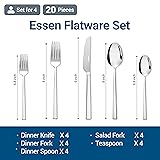 Premium 18/10 Stainless Steel Flatware Set: Made from high-quality food grade 18/10 stainless steel, this durable silverware set resists rust, bending, and dullness. The Essen flatware set combines long-lasting performance with an elegant mirror finish, perfect for everyday meals or special occasions. 20-Piece Flatware Set for 4: This silverware service for 4 includes 4 dinner spoons, 4 dinner forks, 4 dinner knives, 4 teaspoons, and 4 salad forks, a complete cutlery set for small families, apartments, or thoughtful housewarming gifts. Modern Silverware Set with Elegant Design: Featuring sleek straight edges and a polished mirror finish, this utensil set offers the premium look and feel of luxury at a budget-friendly price. Designed as both a daily kitchen flatware set and stylish party silverware set, it suits family meals, celebrations, and restaurant dining. Safe & Comfortable Dining Experience: Each utensil of our spoons and forks set is designed with smoothly polished tines and edges for comfort, while the dinner knife’s precise serration ensures effortless cutting. This balanced and ergonomic flatware makes dining enjoyable, whether it’s a quick breakfast or a full dinner service. Dishwasher Safe Silverware Set: Easy to clean and maintain, this stainless steel silverware set is fully dishwasher safe, ensuring a shiny, like-new look with minimal effort. Perfect for busy households that still want stylish, quality cutlery.