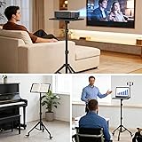 Projector Stand on Wheels: This versatile projector tripod features three high-quality, silent casters that swivel 360° for smooth movement. All casters are lockable for enhanced safety and can be removed for stationary use, making this laptop tripod stand adaptable to various settings Heavy Duty Metal Construction: Crafted from sturdy metal, this projector tripod can support up to 22 pounds, ensuring excellent stability for your equipment. Our rigorous testing has led to this reliable and durable design, perfect for long-lasting use Adjustable Laptop Floor Stand: With a height range of 31-56 inches and a 180° adjustable tray, this projector stand tripod offers the optimal viewing angle for both office and home entertainment, making it an essential addition to your setup Portable Laptop Tripod: This laptop stand tripod is designed for easy assembly and disassembly, perfect for on-the-go use at home, on stage, in the studio, or any indoor or outdoor location Multifunctional Tripod with Wheels: The extra-large removable top tray (15" x 11") is versatile enough to accommodate projectors, laptops, music players, and DJ equipment, making this tripod stand a multifunctional solution for everyday use