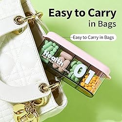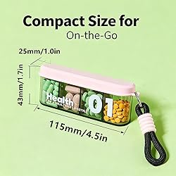 4 Compartments for Tidy Organization: Features 4 independent compartments to keep pills neatly separated, avoiding mixing. Makes daily management of vitamins or supplements easy, ideal for home and travel use Double Lids for Secure Sealing: Upgraded double-layer lids boost sealing performance, locking out moisture to keep contents in good condition. Perfect for preserving supplements whether at home or on the move Sliding Lid for Spill-Proof Safety: Equipped with a sliding lid to prevent accidental opening. Keeps pills securely inside—toss it in your bag or pocket confidently without spills or leaks during travel Compact Size with Ample Capacity: Measures 4.5”L×1”W×1.7”H, holding 30–60 pills (varies by size). Compact for easy carrying, roomy enough for essentials, making it an ideal travel companion See-Through & Dual - Colored: Hands - free design avoids direct pill contact for cleanliness. Transparent cases (one pink, one green) let you check pill quantity/type at a glance.