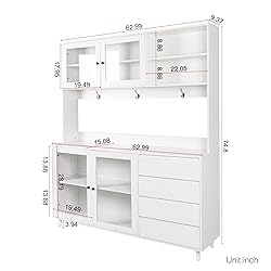 - Keep your kitchen organized with this 63’’ wide kitchen hutch pantry cabinet. Designed with 4 doors, 4 drawers, and a central microwave shelf, it offers plenty of space for cookware, tableware, small appliances, and everyday essentials. The hutch design keeps frequently used items in sight while protecting others from dust.Built from durable MDF with a smooth paint-free surface, this freestanding pantry cabinet with hutch is sturdy, easy to clean, and equipped with quality hinges, glass doors, and metal accessories. Perfect as a kitchen storage pantry, buffet hutch, china cabinet hutch, or butler pantry, it fits kitchens, dining rooms, apartments, or office breakrooms.Measuring 63" W x 15.7" D x 74.8" H, this tall cabinet provides maximum storage without taking up much floor space. With its modern-meets-vintage design, it blends into farmhouse, retro, or contemporary décor—whether you choose the white pantry cabinet with glass doors or the walnut buffet with hutch.