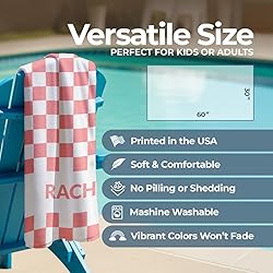 PERSONALIZATION: Fully customizable beach towel with your choice of name or text and 22 different color options for a unique personal touch PREMIUM MATERIAL: Microfiber front designed for vibrant color printing, combined with absorbent cotton backing for superior drying performance STYLISH DESIGN: Classic checkered pattern adds a sophisticated touch to your beach accessories while maintaining functionality SPECIFICATIONS: 30"x60" Large beach towel size perfect for beach, pool, or outdoor activities, featuring one-sided custom printing LOCALLY PRINTED IN USA: Professionally printed in Michigan, ensuring high-quality results and attention to detail