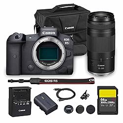 - The Canon EOS R5 Mirrorless Camera combines high-resolution photography with advanced filmmaking features. With its 45MP sensor, 8K video, and in-body image stabilization, it delivers uncompromising performance for professional photographers and filmmakers. Durable, versatile, and powerful, the EOS R5 is the ultimate hybrid camera for creative professionals. Manufacturer Included Items: Canon EOS R5 Mirrorless Camera Canon LP-E6NH Lithium-Ion Battery (7.2V, 2130mAh) Canon LC-E6 Charger for LP-E6/LP-EL/LP-E6NH Battery Packs Canon R-F-5 Camera Cover Battery Pack Cover Strap ER-EOSR5 Canon IFC-100U Interface Cable (39.4") IFC Cable IFC-100U Protector Bundle Items Include: Canon EOS R5 Mirrorless Camera | 45MP Full Frame Sensor 8K Video | In-Body Image Stabilization and Dual Pixel AF for Hybrid Creators Canon RF 75-300mm F4-5.6 Lens 64GB SF-G TOUGH Series UHS-II SDXC Memory Card Canon EOS 200ES Shoulder Bag