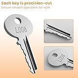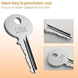 File cabinet replacement keys designed specifically for HON file cabinets and office furniture with L008 key code system File cabinet keys set includes 3 replacement keys precisely cut to L008 key code specifications Versatile use for Hon, Hudson, Fire King, and Chicago file cabinets with code L008, Works for HON office furniture including 2-drawer file cabinets and storage units File a key replacement for HON cabinet lost or damaged keys, keep your file cabinet security Note: Buyer must check that the code on their lock starts with the letter "L" If the keys don't work for you, try using WD-40, wait a few minutes, and try again. You will also check your order and the code written on the lock that they match