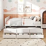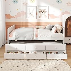 - Description: Discover the ultimate blend of versatile use and modern design with this full size platform bed! The twin size trundle rolls out smoothly, perfect for accommodating guests or for use in smaller living spaces. Additionally, 3 built-in drawers slide out effortlessly, providing classified storage space for bedding, clothes, books or toys. Constructed from solid wood, this platform bed is built with strength and durability. The wooden slats provide reliable support for your mattress, ensuring a comfortable night's sleep. The sleek lines and finish contributes to its modern appeal, easily fitting into various room decorations. Features: Supported by 8 + 8 plywood slats for great strength and stability Solid wood bed frame ensures sturdiness and long-lasting use 3 storage drawers keep a variety of items organized Smooth metal slides and easy-to-grip knobs for convenience Full size bed frame with trundle on smooth rolling wheels Provide a temporary sleeping solution for friends or sleepovers Equipped with trundle stoppers to keep the trundle in place You can place the trundle and drawers on the left or right side as needed Suitable for kid's room, guest room and apartment Assembly required Specifications: Color: White Material: Plywood, Pine Wood, MDF, Engineered Wood Dimensions of Bed: 79" x 58" x 32.5"(L x W x H) Dimensions of Trundle: 75.5" x 40.5" x 15.5"(L x W x H) Inner Size of Drawer: 21" x 15" x 4"(L x W x H) Height of Headboard: 12" Height of Under-bed Space: 16.5" Clearance Between Bed & Trundle: 8" Recommended Mattress Thickness of Bed: ≤6" Recommended Mattress Thickness of Trundle: 5"-6" Net Weight: 127 lbs Weight Capacity of Bed: 250 lbs Weight Capacity of Trundle: 200 lbs Weight Capacity of Drawer: 44 lbs 1 x Bed Frame with Trundle & Drawers 1 x User Guide