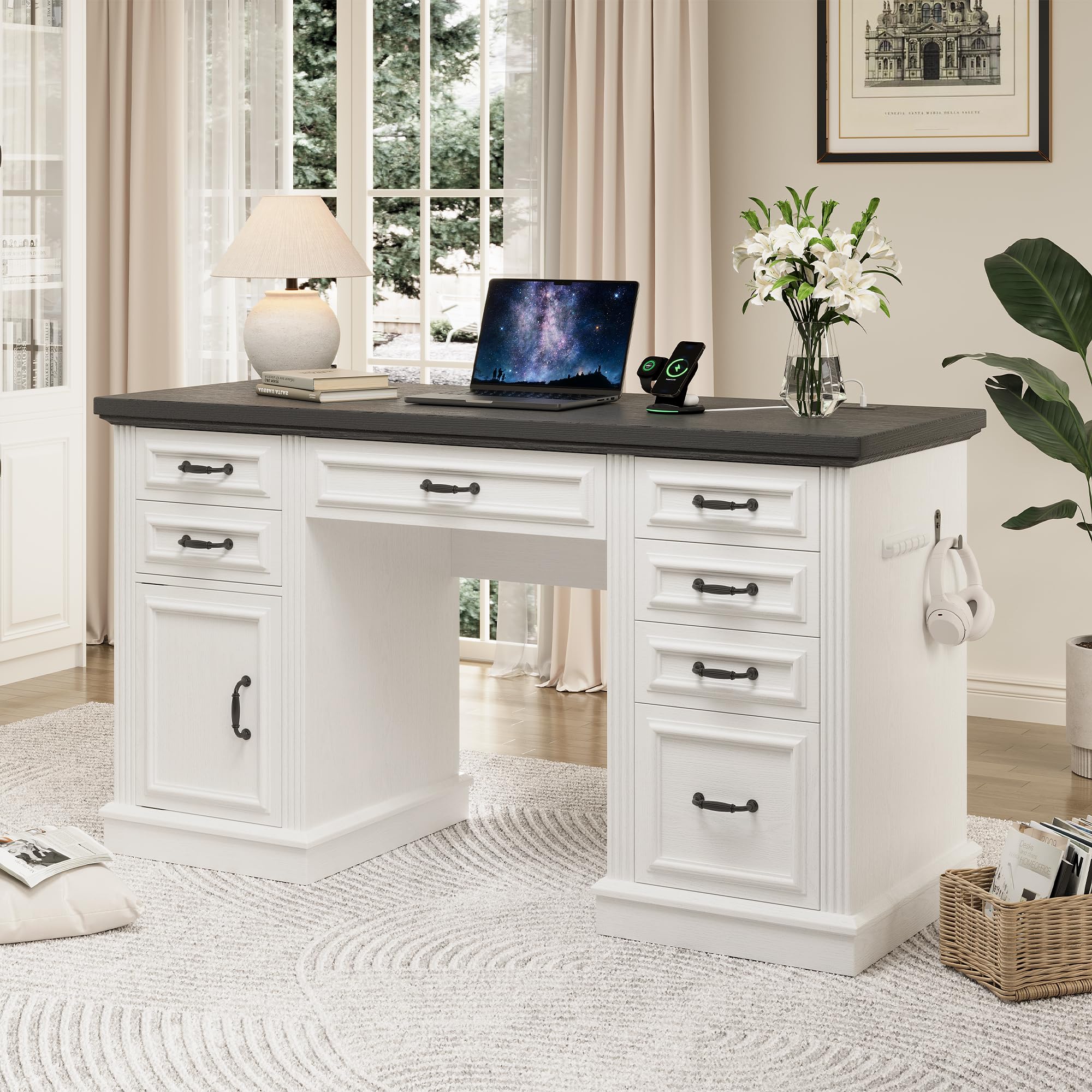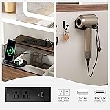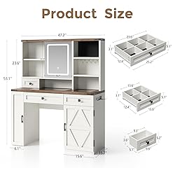 GLASS TABLETOP & DRAWER ORGANIZATION: The farmhouse vanity measures 47.2" W x 15.7" D x 53.1" H, with a sturdy tempered glass top that resists dust and moisture. Under the desktop, two drawers include divided compartments—a 2x3 and a 2x2 section—so your go-to cosmetics and accessories stay sorted and easy to find. ADJUSTABLE SLIDING MIRROR WITH 3 LIGHTING MODES:A generously sized mirror glides smoothly from side to side, revealing hidden three-tier shelving behind it. With just a touch, you can switch between warm, cool, and natural light settings. Hold to adjust brightness for the perfect glow during makeup application, skincare, or styling. BUILT-IN CHARGING HUB FOR ALL YOUR DEVICES: Never run out of power mid-routine! This vanity table includes 2 AC outlets, 1 USB-A port, and 1 fast-charging Type-C port. Safely plug in your hair dryer, curling iron, or phone—all without needing an extra power strip. DEDICATED JEWELRY STORAGE & DISPLAY: Keep your favorite accessories organized and tangle-free. Specially designed sections hold up to 20 pairs of earrings, plus hooks for necklaces and bracelets. Adjustable interior shelves offer up to 14 inches of height, so even longer necklaces hang neatly. HIDDEN SLIDE-OUT SHELVES & STORAGE CABINET: On the left, three smooth-gliding shelves tuck neatly out of sight when not in use—perfect for storing daily essentials without clutter. On the right, a cabinet with magnetic doors offers adjustable shelving and ample room (15.6" W x 15.7" D) for larger tools like hair dryers or straighteners.