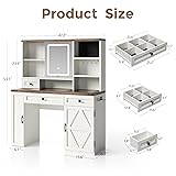 Farmhouse Makeup Vanity Desk with Lights and Sliding Mirror, Glass Top Vanity Table with Charging Station, 3-Tier Hidden Storage, Jewelry Organizer, 2 Drawers, Farmhouse Style for Women, Bedroom-White