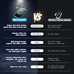 Compatible Car Models:Compatible with cars equipped with OEM wired CarPlay or Android Auto systems,easily enabling screen mirroring to the car display. This wireless CarPlay adapter works with most mainstream car models and is easy to use without complex installation. Built-in Smart System:Equipped with an efficient built-in smart system that supports internet connectivity, offering video playback apps like Netflix, YouTube, TikTok, as well as Google Maps navigation, music streaming, and TF card expansion, enhancing in-car entertainment and convenience.ience. Wireless Sareen Mirroring:Allows wireless screen mirroring from your phone to the car display, supporting Google Maps navigation and music playback,making it convenient to access real-time information and entertainment while driving. Video and Audio Output:Supports video playback and smooth audio output, ensuring drivers can enjoy top-notch audiovisual experiences during their travels,while providing a more comfortable viewing experience during travel breaks. 32GB storage with USB drive support:Equipped with 32GB of memory and high-speed file transfer, allowing you to upload and play your favorite movies via USB drive during your trip in offline mode, without the need for a Wi-Fi connection. Easy Installation and Use:Simply ensure your car is equipped with a wired CarPlay and Android Auto system, connect the vehicle's data port, and you're ready to go. This product is not compatible with cars that have wireless CarPlay or Android Auto systems.If you're unsure whether your car model is compatible, feel free to contact me anytime.