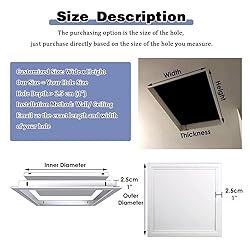 Wall Decoration: This panel blends perfectly into drywall, becoming an instant wall buddy. It creates a discreet hideaway for hidden storage, utility access, and more while maintaining a clean, stylish appearance—ideal for bathrooms, kitchens, and beyond Dimensions: The optional dimensions are the dimensions of the access hole. Custom sizes are available. If we don't have the size you need, please email us to let us know your desired access hole dimensions Metal Access Panel: Access hole cover made from sturdy 1mm thick aluminum alloy material, boasting both durability and longevity; This ensures you will not be making frequent replacements Screwdriver Latch: The access panel features a screwdriver latch, which securely locks it in place, preventing accidental openings while still being easy to remove when needed Convenient: our drywall access panel perfect for concealing electrical panels, HVAC valves, or creating secret storage nooks in walls, ceilings, or floors. Ideal for discreet access in attics, media rooms, or outdoor enclosures—unleash creativity in any space