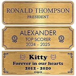 Perfect Size for Trophies & Frames – Each name plate measures 3" x 1", ideal for trophies, plaques, urns, picture frames, and shadow boxes. Compact yet impactful. Available in 3 Elegant Shapes – Choose from Notched Corners, Round Corners, or Square Corners to complement your display. Each shape offers a clean, professional appearance. Perfect for Gifts & Memorials – Great for awards, dedications, and personalized keepsakes. Add a meaningful touch to graduations, retirements, or memorials. Custom Laser Engraving – Personalize with names, titles, dates, or messages. Precision laser engraving ensures sharp, permanent text that won't fade or rub off. Adhesive Mounting Option – Attach easily using the included adhesive backing for a permanent installation on most surfaces.