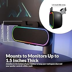 - Bring big sound and vibrant energy to your desk with the patent pending Cyber Acoustics CA-2890GX USB Speaker Bar. Powered by a single USB-C cable with included USB-A adapter, it works seamlessly with PC, Mac, or Chromebook, no installation or software required. This space-saving speaker bar clamps to most monitors up to 1.5 inches thick, features easily accessible controls, and delivers surprisingly loud, crisp audio. Colorful LEDs sync to your music for an immersive experience.