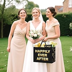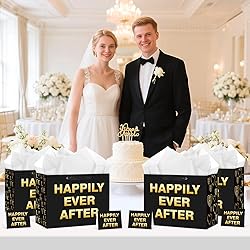 Wedding Themed Gift Bag Set: You'll receive 1 happily ever after gift bag measures 10" x 13" x 5" with 3 pcs tissue paper, 1 pcs wedding card (5" x7") and 1 pcs envelope with double-sided tape. It can hold candles, scarves, standard sized books or DVDs, perfect for wedding wrap gift bags. Vibrant Design: Our stylish bridal shower gift bag is meticulously made with a blend of romance and elegance. Its design, featuring "HAPPILY EVER AFTER" lettering, delicate patterns, and decorative elements, enriches the warm and romantic atmosphere, turning your gift - giving into a touching and memorable moment. Proper Wedding Shower Gift Bags:The bride to be gift bag has a size that provides ample space for gifts like small wedding - themed keepsakes, candies, or beauty products. The white tissue paper neatly wraps most presents. The greeting card gives you room to write heartfelt wishes. Together they make a practical and charming set for your gift - giving needs, effortlessly combining functionality and a romantic wedding - themed look. Superior Quality Materials: The Happily Ever After wedding gift bag is made from quality paper, ensuring durability. It can securely hold gifts of various sizes. The handles offer a comfortable grip. The greeting card, crafted from quality paper, maintains its shape and print quality. The soft, vivid white tissue paper adds a delicate touch and protects the contents inside. Wide Range of Applications: The wedding gift bag set is great for wrapping gifts, ideal for events like weddings, bridal showers, or engagements.Effortlessly elevating the atmosphere, it's essential for crafting unforgettable moments.