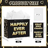 Happily Ever After Wedding Gift Bag - Elegant Black & Gold Bridal Shower Gift Bag Set with Tissue Paper and Greeting Card for Engagement, Bachelorette, Anniversary, and Wedding Party Favors