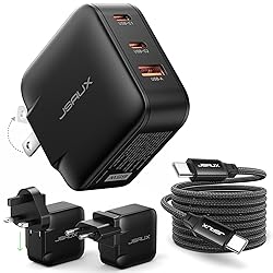 - JSAUX 65W 3-Port GaN Charger: Power, Speed, Portability. Tired of carrying multiple, clunky chargers for all your devices? Meet the JSAUX 65W GaN Charger —the ultimate all-in-one power solution engineered for the modern, mobile lifestyle. Combining cutting-edge Gallium Nitride (GaN II) technology with a thoughtful, travel-ready design, it’s the only charger you'll ever need. Power Everything, Everywhere Whether you're a digital nomad, a busy student, or a professional on the move, our 3-port charger is your universal power hub. USB-C1 Port: Delivers up to 65W for quickly charging your laptop (MacBook Pro/Air, Dell XPS, HP Spectre). USB-C2 & USB-A Ports: Smartly share power to simultaneously charge your iPhone 17, iPhone 16, iPhone 15, Galaxy, iPad, AirPods, and more. The intelligent IC chip identifies each device to deliver the optimal charging speed automatically. Designed for a Life in Motion ·GaN II Efficiency: 50% smaller and cooler than traditional chargers, providing more power in less space. ·Foldable Plug & Global Kit: The sleek, foldable plug protects against scratches and the included UK & EU adapters make it your go-to charger for international travel. ·6.6FT Premium Cable Included: Charge comfortably from a distance with the included durable USB C to C cable, supporting up to 100W power delivery and fast data sync.Charge with Complete Confidence Your valuable devices deserve the best protection. Our charger is built with a multi-protection safety system that safeguards against over-heating, over-charging, and voltage fluctuations. It’s rigorously tested and certified for reliable, worry-free performance day in and day out.What You Get: ·JSAUX 65W GaN II Wall Charger (Black)> ·1x 2-Meter / 6.6ft USB C to USB C Cable> ·1x UK Plug Adapter> ·1x EU Plug Adapter> ·User Manual & 18-Month Warranty