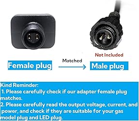 Power specifications: Input: 100-240V AC, 50/60HZ, Output: 12V DC, 1A, Maximum power: 12 W Class 2 power supply 12V1A: suitable for most 12V low-voltage devices, such as Christmas inflatable decorations, Christmas trees, line lights, curtain lights, fountain lights, step lights, and various low-voltage LED devices Safe and Waterproof IP44: This class 2 power supply has an IP44 water resistance rating,However, it is recommended to use a protective cover or enclosure to safeguard the plug and ensure optimal operation,and the power supply does not include wires. UL Certified: This outdoor inflatable adapter is UL certified and equipped with multiple safety mechanisms.110V transformer suitable for most household power supplies in the United States.serves as a perfect replacement for your inflator device plug. Reminder: Before purchasing, please check if the output voltage, current, wattage, and (+/-) two connector holes are suitable for your device