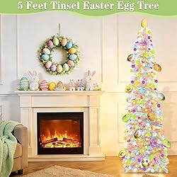 Easter Egg Pop Up Tinsel Tree: Package includes 5 ft Easter tinsel tree(colorful flowers sequins), a Easter egg tree topper, a plastic base, 6 detachable metal tubes, 12 printed Easter egg balls ornaments and 16.4 ft 50 LED warm white string lights Timer Function & Battery-Operated: Our Easter tinsel tree is powered by 3 AA batteries (not included). With the timer function activated, it will turn on for 6 hours and off for 18 hours every 24 hours Easy Assembly & Storage: Our Easter tinsel tree comes with 6 detachable steel tubes and a plastic base, making it easy to install without tools. You can quickly assemble it whithin minutes. When not in use, the tree can be folded up into the box Premium Materials: Our Easter egg tinsel tree is crafted from high-quality shimmering paper sequins that are fade-resistant. Supported by metal tubes and a sturdy four-legged plastic base, it's firm, stable, non-slip and reusable Easter Decorations: Our Easter egg tinsel tree is suitable for Easter Decorations indoor outdoor such as home fireplace, front porch, bedroom, living room, patio, backyard, garden, classroom, office, store, and more
