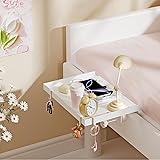 - Upgrade Your Dorm Life with the Ultimate Bedside Companion! Tired of climbing down from your top bunk for every little thing? Our Heavy Duty Clip-On Bed Tray is here to revolutionize your small-space living. Designed specifically for college students in dorms, loft beds, and any bed with a side rail, it brings everything you need right to your fingertips. Why Choose Our Bedside Shelf? Unshakable Stability: Made from robust carbon steel, our shelf won't bend or sag. Feel confident placing your valuable electronics on it. Fold Flat, Save Space: The ingenious foldable design means you can create more room instantly when you need it, making it perfect for tight quarters. Install in a Snap, No Tools Needed: Forget complicated assemblies. Just clip it onto your bed frame (0" - 2.36" thick), and you're done! More Than Just a Tray: We go the extra mile. The integrated cord management hole keeps your charging cables tidy. The 3 complimentary adhesive hooks offer extra hanging storage for your daily essentials. The protective silicone pads ensure a firm grip while safeguarding your bed's finish from scratches. Your All-in-One Organization Hub: From your morning coffee to your late-night study snacks, this shelf keeps your life organized and within reach. Embrace the ultimate convenience and make your bed a more functional and comfortable personal haven. Perfect For: College Dorm Rooms Bunk Beds Loft Beds Frames Beds Small Apartments Anyone who values convenience and smart organization! 【Warm Tips Before Purchase】 For the perfect fit, please measure the thickness of your bed frame or guardrail. Our clamp accommodates frames up to 2.36" (6cm) thick. If you have any questions, our friendly customer service team is always ready to help within 24 hours! Get yours now and transform your bed into the most convenient spot in your room!