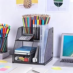 1. All-in-One Mesh Desk Organizer Set Combine file slots, a drawer, pen holder, and tray to organize documents, stationery, and supplies in one go. 2. Durable & Sleek Black Mesh High-quality metal mesh construction is rust-resistant, durable, and adds a modern look to any workspace. 3. Space-Saving Dimensions Modular components (main unit, pen holder, divided tray) are sized to maximize desk space and can be customized for layout. 4. Easy Assembly & Versatile Use Quick to put together, perfect for home/office, Amazon sellers, students—keep essentials organized and accessible. 5. Boost Productivity with Organization Reduce clutter, find items easily, and stay focused on tasks. Ideal for anyone wanting a tidy, efficient workspace.