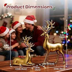 Elegant Gold Reindeer Design: These 2PCS gold reindeer figurines feature one standing and one sitting posture, with smooth lines and a refined golden finish that brings a touch of luxury and holiday cheer to your home decoration. Premium Craftsmanship & Quality: Made from high-quality resin, each deer statue is solid, durable, and resistant to fading or cracking, ensuring long-lasting shine and charm for many Christmas seasons to come. Perfect Size for Any Space: Measuring approximately 6.3”H × 3.5”L (standing) and 4.3”H × 3.5”L (sitting), these compact tabletop decorations fit perfectly on your fireplace mantle, coffee table, shelf, or dining table centerpiece. Versatile Holiday & Year-Round Decor: Not just for Christmas! These elegant reindeer statues complement any seasonal or everyday décor — ideal for your living room, bedroom, office, or festive display arrangements. Meaningful Gift Choice: Reindeer symbolize blessings, prosperity, and good fortune — making this gold deer set a thoughtful and stylish gift for family, friends, or coworkers during Christmas, New Year, or any special occasion.