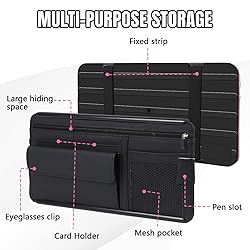 - Specification:Material: Leather+ABSQuantity: 1 PCSColor: Black/ Beige/ Brown/ PinkWeight: 0.66lbSize: 12.2×6.4 inchesFeature: Multifunctional, Convenient, DurableFit Type: Universal FitWhy choose our sun visor organizer?-Multi-pocket design holds sunglasses, cards, receipts, phones and more, keeping your car neat and organized.-Mounted on the sun visor for easy access, with zipper and nylon sticker closures to keep items secure.-Made of premium leather with a smooth texture, wear-resistant, waterproof, and durable for long-term use.-Back straps with adjustable nylon stickers for flexible installation.-Universal fit for most vehicles, also makes a practical gift.