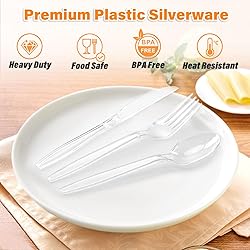 Premium Material: SIUQ clear plastic silverware heavy duty is crafted from crystal-clear, food-grade polystyrene for durability and peace of mind. Its BPA-free construction ensures confident use with every meal, making it a trusted choice for daily dining and all your entertaining needs Extra Heavy Duty: Engineered for superior strength, our heavy duty plastic utensils set features a uniquely thickened no-break design that stands up to tough cuts of meat, dense salads, and sticky desserts. These sturdy utensils resist bending and snapping, delivering the dependable performance of permanentware with all the convenience of disposable Heat Resistant: This versatile disposable plastic silverware set withstands high temperatures, staying rigid with hot foods like soups, grilled dishes, and fresh-from-the-oven meals. It won't warp or soften, ensuring reliable performance every time 360 Value Pack: With 150 forks, 150 spoons, and 60 knives, this disposable cutlery bulk set provides a complete dining solution. Perfect as party supplies or an emergency kit, it effortlessly serves everything from casual family dinners to large gatherings like weddings and catering events Disposable or Resuse: Enjoy effortless cleanup after parties, picnics, or busy weeknights. This plastic silverware is designed for single-use convenience while its durable construction reliably handles everyday meals. Reusability remains a practical bonus, offering flexibility for indoor or on-the-go dining