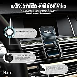 - The iHome Magnetic Air Vent Car Mount is the ultimate sidekick for your daily drive. No more juggling your phone or awkwardly holding it while navigating traffic—this mount keeps your device perfectly in place, even on bumpy roads or sudden stops. Its extra-strong vent clip grips most air vents with confidence, while the stable mounting base ensures zero wobble. The 360° rotating neck lets you find the perfect angle, whether you’re checking maps, taking a hands-free call, or catching a quick video during pit stops. And here’s the magic touch: ultra-strong magnets snap your iPhone 12 or newer (Magsafe compatible) right into place. Alignment is effortless, and the hold is rock-solid, so your phone stays exactly where it belongs—no slips, no fuss. Lightweight, compact, and travel-ready, the iHome mount keeps your dashboard clean and your hands free. It’s more than a mount—it’s your trusty driving companion, helping you stay organized, safe, and entertained. Make your daily commute, weekend road trips, or errands a little easier, a little smarter, and a lot more fun with iHome.