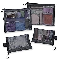 【Comprehensive Pack】You will receive 4 mini mesh cosmetic bags with a flat, compact design for efficient organization and maximum space utilization. The breathable nylon cosmetic bags allow you to organize small items like lipstick, makeup sponges, and office supplies while keeping your purse, diaper bag, or home storage organized. 【Breathable Material】Constructed from durable nylon polyamide mesh, these cosmetic organizer pouches offer excellent ventilation for damp items. The breathable makeup bags are good for storing wet toiletries, used makeup sponges, or brushes that require air drying. Unlike sealed containers, the mesh design promotes airflow while maintaining visibility. 【Portable Multi-Purpose Use】Featuring lightweight construction and hanging loops, these mini cosmetic bags offer exceptional portability for various scenarios. The flexible nylon makeup pouches easily transfer between handbags, luggage, or office spaces while the integrated hanging mechanism allows secure attachment to hooks in bathrooms, closets, or gym bags. 【Durable Construction】This mesh zipper bag is made of durable nylon material to withstand daily wear and tear while resisting breakage and fading. A smooth plastic zipper ensures a secure closure. This durable cosmetic bag provides long-lasting performance and can be used to organize makeup, pencils, and other small items that need reliable protection during transport. 【Multi-Size】This set includes two practical sizes: small (5.04 x 4.06 inches) for lipstick, charging cables, and medium (6.81 x 5.71 inches) for makeup, toiletries, and office supplies. These mesh storage bags come in a variety of sizes to meet different storage needs.
