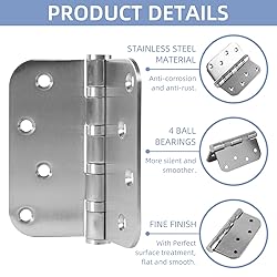 【Premium Material】All parts (including screws) of the door hinges are made of stainless steel material, heavy-duty and rust-resistant. With Perfect surface treatment, our brushed nickel door hinges not only present a classy and modern look, but also feature excellent wear and corrosion resistance, and can last for many years without rusting or fading. 【Size Specification】Each heavy duty hinge measures 4.0 inches in length, 4.0 inches in width and 0.12 inches in thickness with 5/8" radius corners and 8 countersunk screw holes. Max rotation angle up to 315°. Standard size is compatible with most doors. 【Sturdy Construction】Built-in ball bearing makes it quieter and smoother when you open and close the door. Unlike normal door hinges, our ball bearing door hinges are specifically manufactured with non-removable pins for enhanced security and stability, especially for heavier doors. 【Easy Installation】Package includes 12 pcs door hinges and 96 pcs matching screws. All you need is a screwdriver or electric drill and complete the installation or replacement in minutes. We recommend you install three stainless steel hinges on each interior or exterior door. 【Versatile Application】These heavy-duty door hinges are widely used for commercial or residential doors like office doors, warehouse doors, kitchen and bathroom doors, yard gates, garage doors, etc. They also can be mounted on cabinets, wardrobes, shutters, skylights, wooden boxes or any other wooden surface.