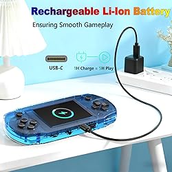 16 bit Handheld Games for Kids: This retro handheld game console has 16 bit 100 classic video games for children, including adventure, casual, sports and puzzle genres. It's as fun as many of our other retro consoles, and our portable game consoles manuals come with game guides to help your kids master each one easily Larger and Clearer 3.2"IPS Screen: The handheld video games features a 3.2 IPS screen, providing a smooth and enjoyable gaming experience. Whether used for travel or at home, the vivid graphics and user-friendly interface will keep children entertained Modern Transparent Design: This video game console has a transparent, tech-inspired exterior with a frosted surface that resists fingerprints and scratches. With an ergonomic curved body and sensitive buttons, the retro gaming console offers an enhanced gaming experience, especially for young gamers travelling and taking a car ride. Tip: The handheld game console doesn't have a headphone jack, but there is a scroll wheel next to the charging port on the top of the console. This scroll wheel can be moved left and right to adjust the volume Long-lasting Rechargeable Battery: This mini retro gaming system features a convenient modern USB-C port and a rechargeable lithium-ion battery, delivering up to 5 hours of gameplay for gaming on the go Gift for Kid's Games: This mini arcade toy is an ideal gift for family, friends, game lovers and nostalgic gamers for birthdays, Easter, Christmas or any holiday. It's also ideal for traveling, flying, or leisure time at home