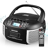 - CD and Cassette Player Combo, Boombox CD Player with FM Radio/Bluetooth/AUX/USB/Tape Recording Remote Control Headphone Jack LCD Display Dual Stereo Sound DC 5V 2A/6 C Battery Powered for Home