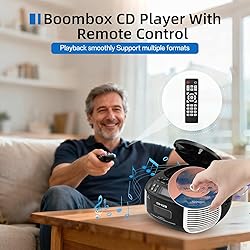 Versatile CD & Cassette Playback: Enjoy audio your way with this versatile boombox. Play standard CDs or MP3 files on CD-R/CD-RW discs, listen to cassette tapes, or stream music wirelessly through Bluetooth. It also accepts USB drives and AUX input, and includes FM radio for additional content. With a built-in headphone jack and remote control, you can conveniently enjoy music, radio, audiobooks, and personal playlists wherever you go Bluetooth/USB/AUX Playback: More than just a CD player, this device provides versatile music access through Bluetooth, USB, and AUX input. Connect wirelessly via Bluetooth 5.1, use AUX for a stable wired connection, or insert a USB drive to play songs or audiobooks directly. The compact remote allows effortless control from a distance, letting you listen to your favorite tracks while doing chores or moving around your home Cassette Player & FM Radio: Enjoy both cassette tapes and built-in FM radio with this versatile player. The extended antenna provides strong reception across FM 87.5–108 MHz, and the LCD display makes station tuning easy. Record radio shows or voice memos onto a blank cassette with one button—perfect for custom mix tapes or saving personal moments. Dual 3W stereo speakers deliver clear, loud sound for immersive listening at home or outdoors Dual Power & Headphone Jack: This CD and cassette player operates on a DC 5V 2A adapter or 6 C batteries (not included), giving you playback at home or on the go—great for outdoor use or power outages. The built-in carrying handle makes it easy to transport from room to yard to travel. It also includes a headphone jack for private and immersive listening—perfect for late-night audio or personalized sound experiences Complete Package & Nice Present: The package comes with 1 cassette cd player, 1 USB cable, 1 user manual, and 1 remote control. This CD cassette player features a classic, user-friendly design that makes operation simple and intuitive. It's a practical choice for music lovers, language learners, and also a thoughtful gift for family or friends. Suitable for both younger listeners and seniors, and ideal for home use or outdoor enjoyment—it provides lasting listening pleasure for everyone