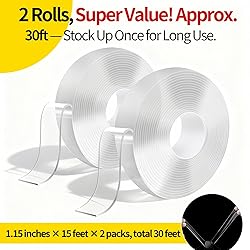 2 rolls total 30FT (15FT/roll) with 1.2 Inches width—covers more area than single rolls. Cost-effective for large projects like carpet fixing or wall decor, no need to repurchase soon. 0.07 Inches thick + 1.2 Inches wide design—stronger adhesion than thin tapes. Securely holds pictures, shelves, or rugs without slipping; ideal for heavy-duty needs. Peel off easily with no sticky marks, Safe for wood, glass, metal, and tile—perfect for renters or anyone who hates messy residue from old tapes. Waterproof after installation—works in bathrooms, kitchens, or outdoor areas (car, camping). Replaces nails/screws for hanging, organizing, or securing items indoors/outdoors. stick press 20s to install. Thin 0.08 Inches design stays nearly invisible on surfaces.
