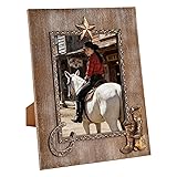 RUSTIC COOL WOOD FRAME 8 X 10: Rustic cowboy picture frame with natural texture in the wood frame and cowboy element design, Simple & weathered wood color vintage farmhouse style. PERFECT SIZE FOR DECOR: Our farmhouse cowboy picture frame is perfect for 8 x 10 photo & image, we are good for standing desktop or wall mounting display, and we have 1 sawtooth hook for this 8 X 10 wood frame great to show your pictures vertically. HIGH QUALITY: Our 8 x 10 frame is all handmade and made of premium natural wood material which features no odor, fine workmanship, clear definition glass with excellent sealing to protect the inner pictures well, and durable and reliable, vertical wall decor. MULTIPLE DECORATION: This 8 x 10 wood picture frame is a great gift for family, friends, mother, girlfriend, or woman, it's perfect for decorating for multiple, such as office, home bedroom, cafe, living room, dining room, bedroom, kitchen, galleries, corridors, porches, stairs. PERFECT GIFT FOR SURPRISE: Our 8 by 10 wooden picture frame is unique farmhouse style, great for decorative your house, and can be very good to preserve your precious memorable moment for years, this wooden hanging picture frame will be a great gift for family or friends to deliver surprise in housewarming, baby shower, birthday, wedding, anniversary, Mother day, Father day, New Year, Christmas, etc.