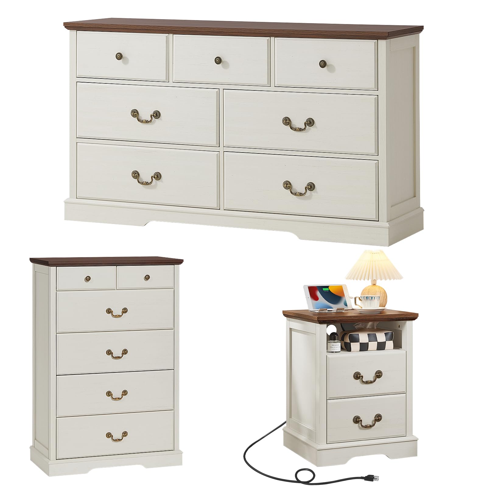 【Farmhouse Wood Nightstand】Our nightstand featuring a vintage design paired with an elegant texture, combines farmhouse style with modern style and is the ideal match for your bedroom furniture. 【Bedside Table with Charging Station】 This storage-equipped bedside table set includes two standard AC power outlets and two USB ports, allowing you to conveniently charge your phone, tablet, or other electronic devices by your bedside or sofa. Perfect as a side table or sofa table next to your favorite seating area. 【Enough Storage Space】The wooden nightstand measures18"L x 18"D x 24"H. This nightstand offers ample storage space for your essentials. It features 1 open shelf for books, decor, or other items, plus 6 spacious drawers to help keep your space organized. Perfect as a nightstand in the bedroom or a sofa table. 【Durable and Versatile】Crafted from sturdy wood, this rustic brown nightstand boasts a reinforced tabletop that can withstand considerable weight without warping or damage. Thickened legs enhance durability and stability, making it a versatile piece for use as a bedroom nightstand,sofa table, or in any space requiring extra storage. 【Thickened Packaging】This wooden nightstand arrives in thick foam packaging for secure shipping, ensuring it arrives intact. We also include clear illustrated assembly instructions with individually labeled tools and parts for easy setup. The quick and straightforward installation process lets you effortlessly enjoy your farmhouse nightstand.