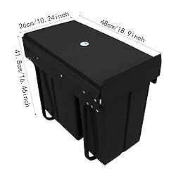 - SpecificationMaterial: ABS, PP, IronCapacity: 10L+20L/2.64Gal+5.28GalProduct Size: 48*26*41.8cm/18.9*10.24*16.46inPackage Included1* Under Cabinet Trash Can1* English Assembly Diagram