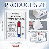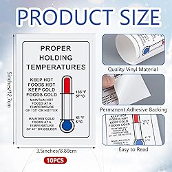 - Feature: Serviceable performance: Our proper holding temperatures label maintains legible images and text even in harsh environments, ensuring long-term use during food handling. Improve food safety: These temperature label stickers can warn you to keep food within safe temperature ranges, preventing spoilage and health risks caused by improper temperatures. Specifications: Material: vinyl Color: white Size: 5 x 3.5 inches (L x W) Package includes: 10 x Proper holding temperatures label decal Warm notes: Please allow slight errors in size due to manual measurement. Due to different angles of light and shadow effects, please allow a little color difference with the pattern