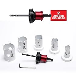 QuickCore’s patented technology provide up to 10X FASTER CORE EJECTION through the unique open-ended design this means less time spent clearing out debris and more time getting the job done QuickCore’s patented mandrel enables the user to quickly change hole saw sizes 7 pc hole saw Set -1", 1 1/4", 1 1/2", 1 3/4", 2", 2 1/2" Hole Saws, with 2 Arbors, Pilot Drill Bit, Hex key Wide diamond slots and open back arbors allows for increased visibility and cooling M42 Bi-metal construction for cutting into wood, metal, plastic and stainless steel. 10 degree positve angle fast and smooth cut Built to Last: With 10x more life than standard hole saws, you won't have to worry about replacing worn-out tools as often, saving you money in the long run Versatile and Convenient: One mandrel for sizes 3/4" to 6", making it perfect for a wide range of applications