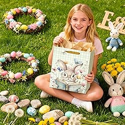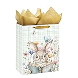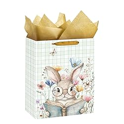 CUTE WATERCOLOR BUNNY DESIGN: Features an adorable bunny with glasses reading a book among pastel wildflowers and butterflies, adding a charming springtime touch to your Easter gifting. MEDIUM SIZE FOR MULTIPLE GIFTS: Sized at 13" x 10" x 5", this bag fits books, plush toys, candles, self-care items, treats, and small holiday gifts—ideal for Easter baskets or spring celebrations. DURABLE & EASY TO CARRY: Made from thick coated paper with reinforced sides and sturdy ribbon handles for reliable support while carrying gifts of various weights. INCLUDES MATCHING TISSUE PAPER: Comes with coordinating tissue paper for a complete gift-wrapping solution, perfect for kids, teachers, coworkers, friends, and family. VERSATILE SPRING GIFT BAG: Suitable for Easter celebrations, spring birthdays, school events, teacher appreciation, baby showers, and everyday thoughtful gifting.