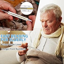 Individually Packaged Dual-scale Temperature: The size is about 5.31 x 0.67 x 0.43inch/13.5 x 1.7 x 1.1cm. It comes with a storage box to protect the temperature from damage and is also convenient for storage and carrying Accurate Measurement: This glass temperature is made of glass material. The built-in temperature probe can sensitively sense changes in body temperature Easy to Use: Shake well to below 35℃ before use. You only need to place the temperature probe in the middle of the armpit for 5 minutes, and then rotate the temperature in a bright place to view the specific measurement value. Please return it to the box immediately after use Fast Reading: The scale of this large dual-scale temperature is clearly visible. The numbers on both sides are large and clear, and the elderly at home can also read it easily Universal Temperature: Suitable for people of all ages. Widely used in hospitals, homes and clinics. Mainly used for underarm temperature measurement, can be put into the mouth when necessary