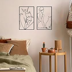 DUOOLN Women & Cat Metal Wall Decor Art- Modern Minimalist Line Hanging Sign, Woman and Animal Style Paintings for Bedroom Bathroom Living Room Home Elegant Feature Wall- Style A -15.7x10.2in