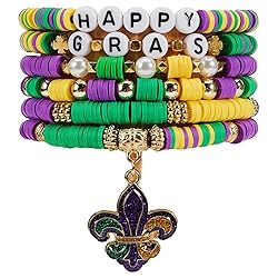 - Elevate your Mardi Gras celebration with this vibrant 6-piece bracelet set! Crafted with eye-catching purple, green, and gold beads—these colors symbolize justice, faith, and power, the core of Mardi Gras tradition—each bracelet boasts unique designs. Featuring “HAPPY MARDI” letter beads, sparkling crystal beads, colorful disc beads, and a charming jester mask charm, this set blends fun and festivity seamlessly. Made with high-quality materials, these stackable bracelets are durable yet lightweight, ensuring all-day comfort whether you’re parading through New Orleans or hosting a carnival-themed party. The versatile design allows you to wear them together for a bold statement or mix and match with other jewelry for a personalized look. Perfect as a gift for Mardi Gras lovers, party favors, or a treat for yourself, this bracelet set captures the spirit of carnival season. Embrace the joy and vibrancy of Mardi Gras—add this must-have accessory to your collection and let the celebrations begin! 🎭